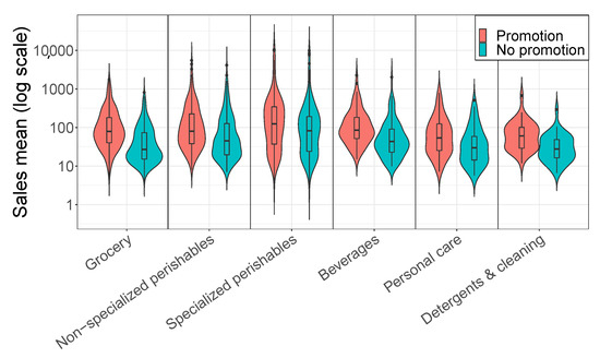 Distribution of the average weekly sales on promotional and non-promotional weeks by category.