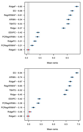 We can also use the MAE and MSE errors to perform tests on the statistical significance of any reported differences. To this end we use the Multiple Comparison with the Best (MCB) test, advocated by [68]. This is a restricted version of the non-parametric Nemenyi test [69], focusing only on testing the best performing model against the rest. The test is implemented using the nemenyi() function of the R package tsutils [70]. Finally, as part of the testing, we also report mean ranks of the various forecasts.