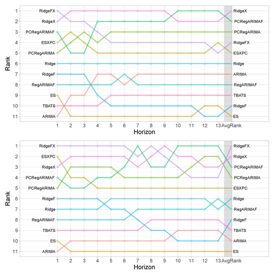 Figure 4 provides the ranking of the models for the various forecast horizons separately. This provides some interesting insights in terms of the progression of the forecasting performance. We observe that in all cases the models with the covariates rank better than the univariate benchmarks. Notably, PCRegARIMAF performs better for longer-term forecasts, for both MASE and RMSSE. So far we have observed a difference in the performance of RidgeX and RidgeFX. This difference becomes clearer when we track the ranking across horizons. In both cases, RidgeFX performs better for short horizons. This is in agreement with the summary statistics in Table 4. The same behaviour is observed for the univariate counterparts, Ridge and RidgeF. This is in contrast to the results for ARIMA in terms of using trigonometric seasonality or not, and arguably the same can be said for the performance between ES and TBATS, with the latter performing better for longer horizons.