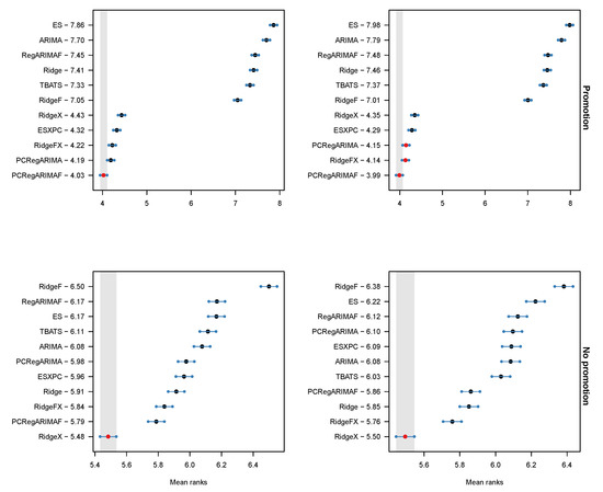 To better compare the models we provide in Figure 3 the models’ mean rank and the results of the MCB test at a 5% significance level, for the horizon 1–13. The forecasts are ranked by their mean rank, which is reported next to their name. The best performing forecasts are at the lowest of the plot and surrounded by a greyed area. For any other forecasts overlapping this area there is no evidence of statistically significant differences. The lines surrounding the forecasts are the critical distances of the Nemenyi test, which function in the same way. The horizontal axis plots the mean rank of the forecasts. For both error measures, RidgeX ranks first. The difference in the top ranking between Table 4 and Figure 3 is attributed to the distribution of the forecast errors, as the mean rank is non-parametric and therefore resilient against outlying errors. Again, we find that models that include the covariates perform best. There is evidence that including these with a shrinkage estimator performs better than using PCA to compress them, although the PCRegARIMAF remains a strong contender. ESXPC trails other models with covariates, yet is substantially better than any of the univariate benchmarks. Last but not least, for almost all of the reported differences there is evidence that they are statistically significant. The results for the other forecast horizons differ slightly, but the key conclusions remain the same, with evidence of significant differences between most cases. We return to the relative performance of PCA and shrinkage estimators when we analyse the results for promotional and non-promotional periods separately.