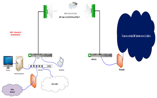 The fading margin was 52.83 dB. The link throughput was 200 Mbps/128 QAM. A firewall was used to secure the system. Figure 2 and Table 1 provide, respectively, the microwave link in line of sight and the link budget details which were produced by Aviat Networks, Inc., Austin, TX, USA.
