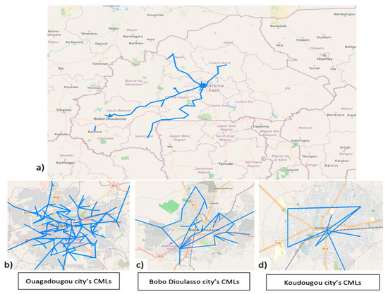 Figure 4 shows an overview of all the CMLs of the Telecel Faso’s network in Burkina Faso connected to the data acquisition system (a), as well as the CML distribution in the cities of Ouagadougou (b), Bobo-Dioulasso (c), and Koudougou (d).
