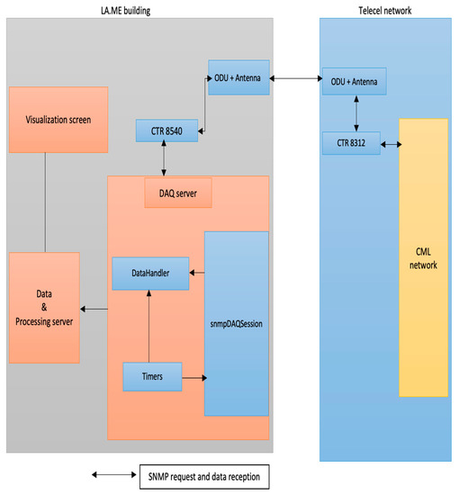 In 2015, Fencl et al. [21] proposed a custom data acquisition software running within an operator’s CML network. This software is only capable of serial data acquisition and does not appear to be suitable to provide data for a large number of CMLs with consistently high temporal resolution.