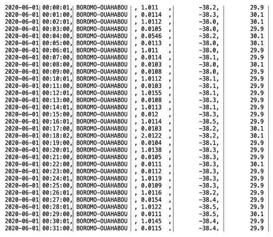 For this purpose, a metadata file was built with the help of Telecel Faso since 2019 and regularly updated. This metadata file contained the identifiers, lengths, frequencies, and polarizations of the different links, as well as the latitudes and longitudes of the pylons.