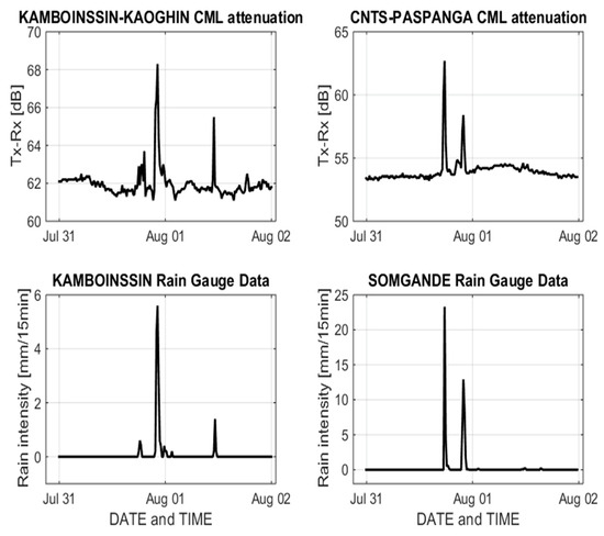 Figure 8 shows the attenuation time series of two CMLs integrated to the acquisition system and the rainfall data from two rain gauges of the Agence Nationale de la Météorologie (ANAM) of Burkina Faso, for the rainfall events of 31 July 2019, and 1 August 2019. The data from the rain gauges are used here as references for the CML data validation. The two rain gauges used in this experiment are installed in Ouagadougou, Burkina Faso, at the SOMGANDE and KAMBOINSSIN sites and record rainfall intensities at a 15 min time step.