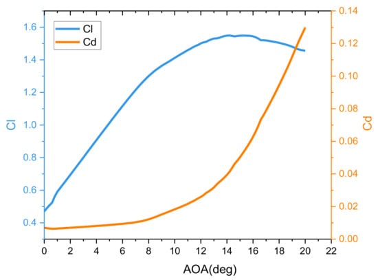 According to Equation (1), the Reynolds number changes in terms of the chord (c) and the radius (r). Therefore, it is difficult to determine the initial value to start the calculation process, so it assumed the average value of the Reynolds number to facilitate the calculation process of a 5 kW HAWT with a rotor diameter of 5 m. It was found that the value of Reynolds number is about 450,000 at the tip chord of 0.106 m of the blade. In order to calculate the lift and drag coefficients, the XFoil software was used. Where the XFoil is embedded in QBlade, and the results are shown in Figure 3. The maximum ratio Cl/Cd is 119 at the angle of attack (AOA) which is equal to 6°. This angle is called the design or optimal angle of attack. The lift coefficient at the optimal angle is = 1.12. can be used to find the relative angle [21]: