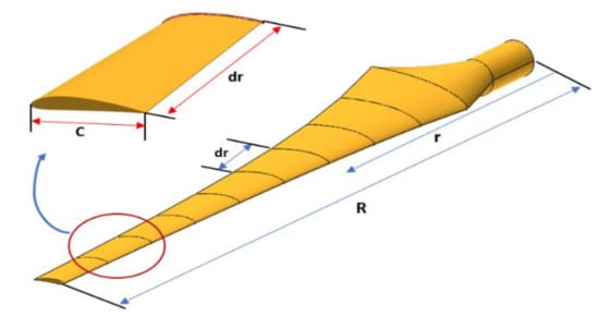 A new code was developed using MATLAB software based on the Betz concept to calculate the parameter of the blade geometry (relative angle (), chord length (c), twist angle ()). Then, all the parameters are transferred to QBlade software to estimate the load and performance of the blade based on the BEM method. Figure 2 shows the aerodynamic loads for each blade element. BEM theory splits the blade into a finite number of independent sections that are uniformly distributed along the blade’s length. A two-dimensional airfoil was used to determine the aerodynamic forces that were generated in each blade section based on a certain radial position. In this work, the blade is divided into 10 sections. The first step in QBlade is to calculate the airfoil’s coefficients (lift and drag), where the lift and drag are affected by the Reynolds number (Re) and the angle of attack. Reynolds number is defined as the ratio between the inertial force to the viscous force, which is given by the following equation [21]: