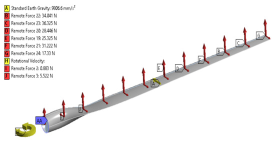 The blade of the wind turbine is fixed at the root side, so it was considered that all degrees of freedom (DOF) are null at the root, and on the tip, the blade is free to move. The blade rotates at a constant rotational speed during the analysis. The applied pressure is distributed over the shell of the blade. But the loads were calculated by the BEM theory applied at the center of the loads for each section of the blade. It was considered the force of gravity in the center of gravity of the blade mass. The loads and boundary conditions that are applied to the wind blade are shown in Figure 6.