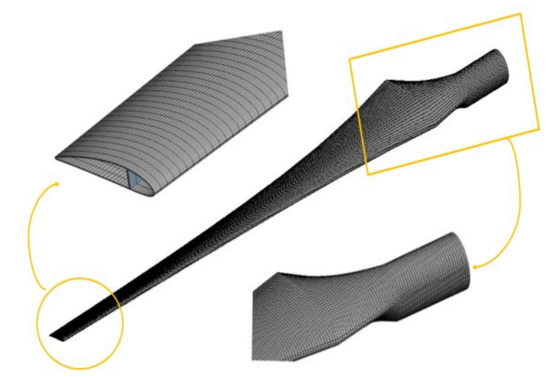 During the operation of the wind turbine blade, it is subjected to several loads, which leads to occur the bending and deflection of the blade. In order to simulate the wind turbine blade, the appropriate mesh should be chosen to match the geometry and material composition. In this study, it was selected the element (shell 281) to build the FE model. This element has eight nodes, and each node has six DOF. The Grid Independence Test was achieved to find the wind turbine blade’s most optimal mesh, as shown in Table 5. Figure 7 shows the most optimal mesh of the wind blade.