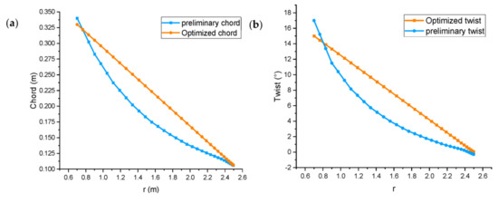 Blade distribution (a) chord Length and (b) twist angle.