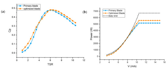 Figure 8 shows the difference between the initial design based on the Betz theory (BEM), which is a parabolic curve, and the new design (improved). The improved design is based on the linearization design, where it is a straight line from the root to the tip for both the chord and the twist angle. Figure 9 shows the initial and optimized wind turbine design’s power coefficient and power curve.