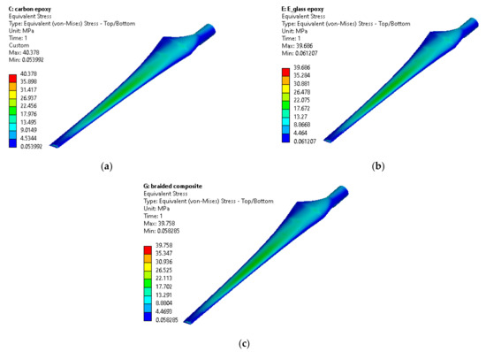 Distribution of Von Mises stresses of (a) carbon/epoxy, (b) E-glass/epoxy, and (c) Braided composite.