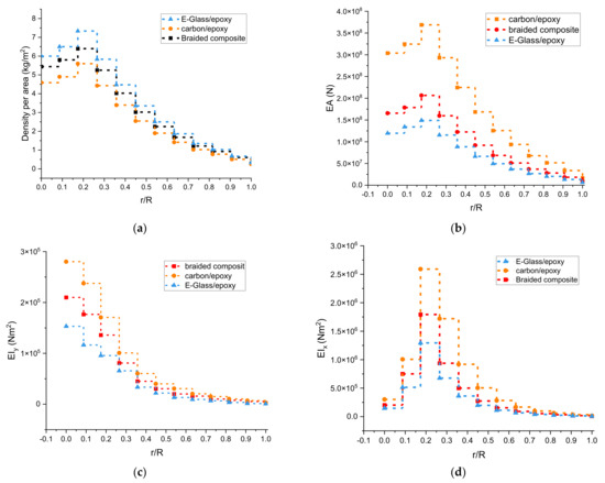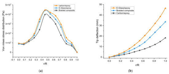 Based on the results of Figure 12, it can be seen that the largest value of the stresses occurred at r/R = 0.5, i.e., in the middle of the blade. This is accrued because the thickness distribution of the shell at the root is appropriate. This causes the stress concentration in the middle of the blade, i.e., in the area of least damage and risk. While results of Figure 12b showed that the largest deflection occurred for E-glass material, followed by braided composite material, and then carbon epoxy material. Figure 13 shows the wind turbine blade’s distributions of mass and stiffness. It is clear that this distribution was linear, thicker on the root side and less thick on the tip side. This makes it a suitable distribution for the composite materials layers along the length of the blade.