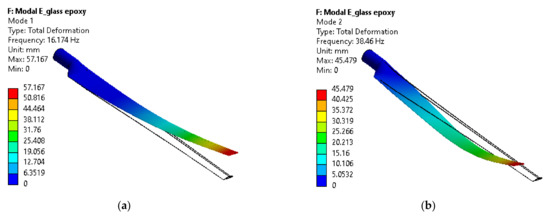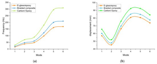 The wind turbine blade’s structural stiffness depends on the materials’ properties, especially Young’s modulus (E) and the density (ρ). Therefore, the natural frequencies of the wind turbine structure depend basically on the ratio (). According to the results of the modal analysis of the wind turbine blade in Figure 14a, it’s observed that the frequencies of the E-glass fiber material were less than those of braided composite and carbon epoxy materials, which made it less resistant to vibrations. Despite this, the braided composite and E-glass material results are not considered far away due to the convergence of their ratio (). While the carbon/epoxy material has the highest natural frequencies compared with the other materials because it has the highest ratio of (). Figure 14b shows the displacements of the blade tip at the selected modes shape of the three proposed materials. It can be seen that the carbon/epoxy material had the least displacement, due to the high stiffness of the material, followed by the braided composite material and then the E-glass/epoxy material. Also, it can be noticed that the highest value of the displacement occurred in the 4th and 5th modes, which makes them the two critical/dangerous modes for blade design.