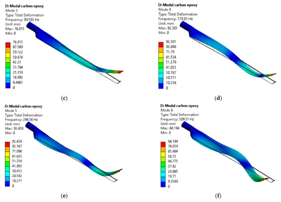 The first 6th mode shape of Carbon/Epoxy material. (a) 1st mode. (b) 2nd mode. (c) 3rd mode. (d) 4th mode. (e) 5th mode. (f) 6th mode.