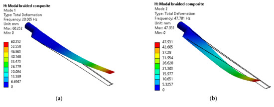 Further, it was found that the minimum tip deflections were 18.29 mm, 33.54 mm, and 46.46 mm, corresponding to the blade being made of carbon fiber material, Braided composite, and E-glass material, respectively. Hence, it can be concluded that the optimal material in terms of the magnitude of deflection is carbon fiber material. The modal analysis results showed that the natural frequencies of wind blade made from E-glass has the lowest natural frequencies (1st: 16.17 Hz and 2nd: 38.46 Hz). On the other hand, the wind blade made of carbon fiber has the largest natural frequencies (1st: 29.58 Hz and 2nd: 70.20 Hz).