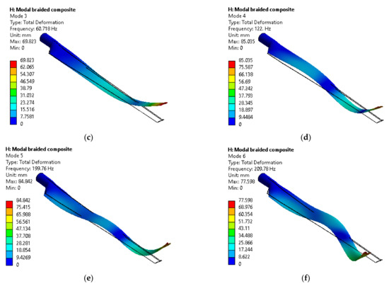 The first 6th mode shape of Braided composite material. (a) 1st mode. (b) 2nd mode. (c) 3rd mode. (d) 4th mode. (e) 5th mode. (f) 6th mode.