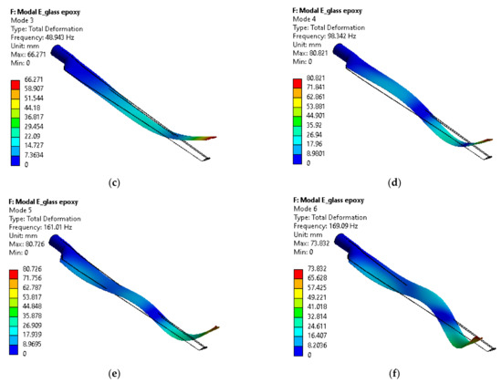 The first 6th mode shape of E-glass/epoxy material. (a) 1st mode. (b) 2nd mode. (c) 3rd mode. (d) 4th mode. (e) 5th mode. (f) 6th mode.