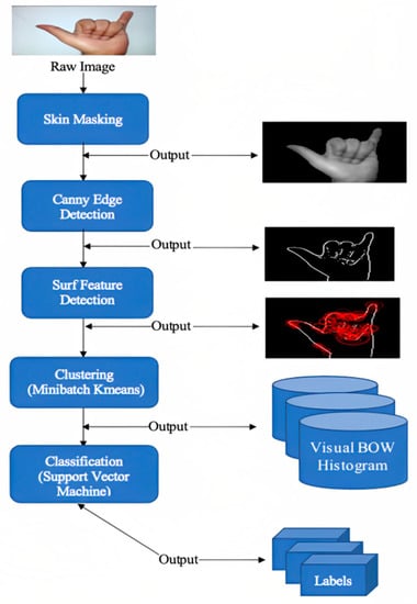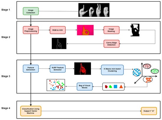 Figure 2, which is divided into four stages. Stage 1 is the picture collection stage, where 42,000 photos of the alphabet (A–Z) and numbers (1–9) are used. The next step is Stage 2, also known as image pre-processing, where an image is converted from RGB to HSV. Given that we are dealing with color-based object recognition, the HSV picture is utilized to isolate a certain area (i.e., a hand-making gesture). This strategy aids in background minimization so that our model may concentrate on the object crucial to the research. The next phase is Canny edge detection, a multi-part procedure that begins with smoothing the image to minimize noise, locating the image’s gradient to highlight edges, and using non-maximum suppression to obtain thin edges. Following this, we proceed to the third stage, feature extraction, which begins with the SURF feature extractor, which, in contrast to SIFT, is resistant to perspective scaling, rotation, variation, and occlusion. After passing through K, mini batch clustering, visual words, and finally, visual vectors are produced. The final stage employs SVM (support vector machine) to classify and forecast an output after this.
