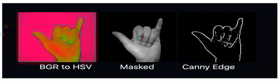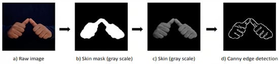 Figure 4). Skin pixels were defined by pixels there in the (H, S, V) range of (0,40,30) to (43,255,254). A skin mask could be used to and isolate the hand in the image. Lastly, the Canny edge method [