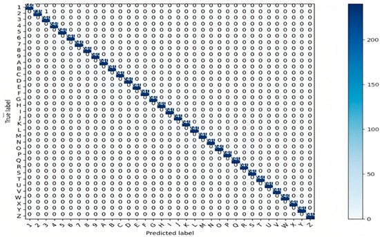 Figure 9, the x-axis represents the predicted label, which denotes the class or category our model assigned to that instance. In contrast, the y-axis represents the true label, which refers to the actual category of an instance in the dataset. The count or frequency of instances falling into each combination of true and expected labels is contained in the cells of the confusion matrix. In our example, the letters A–Z and the numerals 1–9 will create a 36 × 36-dimension confusion matrix. Each cell will store the number of times the true label is either a number or a letter and the predicted label is a different number or letter. The confusion matrix column with the value 240 indicates 240 cases in which both the true and predicted labels correspond to the given combination.