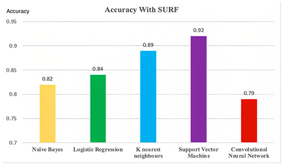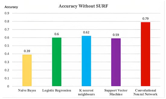 Figure 11, implementing the SURF feature extraction technique improved the accuracy of all the classification models. Naive Bayes, logistic regression, K nearest neighbors, and support vector machine showed a significant increase in accuracy when using SURF, with K nearest neighbors showing an increase of 27%. Convolutional neural networks, on the other hand, did not show any improvement in accuracy with the use of SURF. The naïve Bayes model showed the lowest accuracy without SURF, with only 39%, while K nearest neighbors showed the highest accuracy without SURF, 62%.