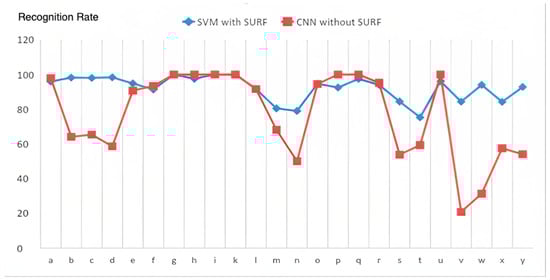 Figure 12 that the recognition rate of SVM using SURF is significantly better and consistent than for CNN without using SURF, which shows better results than CNN with using SURF, as observed earlier in