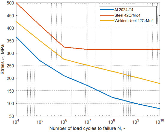 An important aspect of the conducted research is the knowledge of the phenomenon of material fatigue. The construction of the gondola, as mentioned earlier, combines aluminum (Al 2024-T4) and steel (welded) elements made of 42CrMo4 alloy. Depending on the mechanical properties, these materials are characterized by different fatigue strengths caused by a different internal structures and mechanical properties of the materials. Examples of Wőhler plots (S-N curve) are presented in Figure 1.