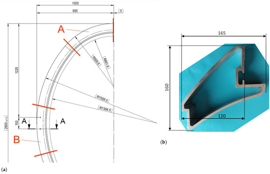 Figure 4. Dimensions of the profile forming (a) the ring “A” and “B”, and (b) section through the profile used to create the gondola rings. - the second ring (hereinafter referred to as the “B” ring)