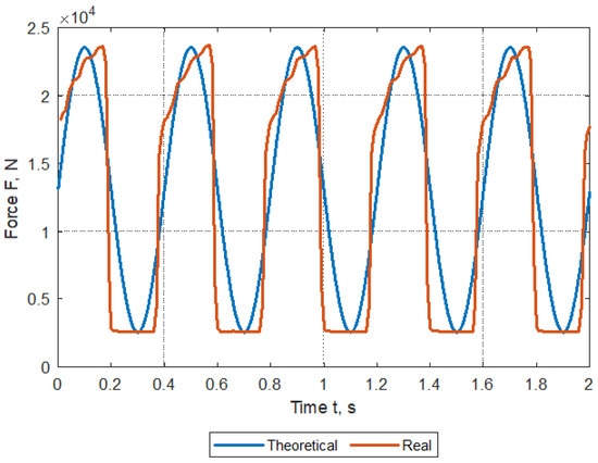 In accordance with the aforementioned normative guidelines, the test should be carried out with the assumption of a sinusoidal nature of the load. In fact, such a state is difficult to implement and at the assumed frequency of Hz, the structure requires adequate time to return to the state before the load. For this purpose, the parameters controlling the pressure valve were appropriately selected, which allowed obtaining a course close to the theoretical one (Real—Figure 7).
