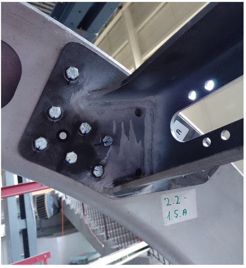 The tested structure, as mentioned earlier, is divided into several components connected with bolts. The screw connections used, in accordance with the manufacturer’s data, were tightened with the appropriate—planned tightening torque and secured with appropriate nuts and glue. However, bearing in mind the possibility of loosening the connections, it is necessary to determine the original position of the bolts relative to the elements and their subsequent verification in order to determine the appearance of potential play, rotation, or loosening of the bolts. An example of bolt designation is shown in Figure 8.