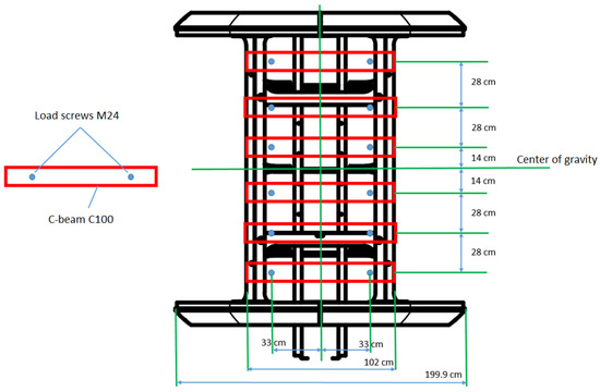 According to the EN 13796-1 standard, the load should be evenly distributed on the floor. Due to the above, it was decided that the load would be carried by a series of 6 C100 beams lying horizontally. The number of beam sections was selected based on the assumed passenger capacity of the tested gondola—6 people. Each beam bar rests on edge beam bars and angle bars from the bottom gondola frame (Figure 6a). The arrangement of C-beams and force application points is shown in Figure 9. Due to the fact that the total load should be 21 kN, theoretically, one bolt carried about kN. A total of 12 bolts transferred the load between the beams (and the bottom frame) and the lower load-generating system connected to the pneumatic actuator. C-beams are spaced every 28 cm, of which the two middle ones are offset from the gondola axis (in the direction of the Y axis) by 14 cm. At the same time, the loading bolts are distributed 33 cm from the central axis of the gondola (in the direction of the X axis), i.e., the distance between the bolts is 66 cm. This distance corresponds to about 1/3 of the width of the entire gondola ( cm) and about 2/3 of the width of the bottom frame of the gondola (102 cm). At the same time, the extreme points of force application are approximately cm from the edge of the bottom frame/rings.