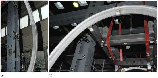 At this stage, the strength cage around the gondola was covered with coded markers, constituting reference points, enabling correlations of the location of measurement points from subsequent photographs. Placed markers had the form of single points on magnetic pads or crosses with 9 coded points. On the gondola, 82 uncoded markers (measuring points) were glued, which were then recognized by the software. An example of the arrangement of reference and measurement points is shown in Figure 10a,b.