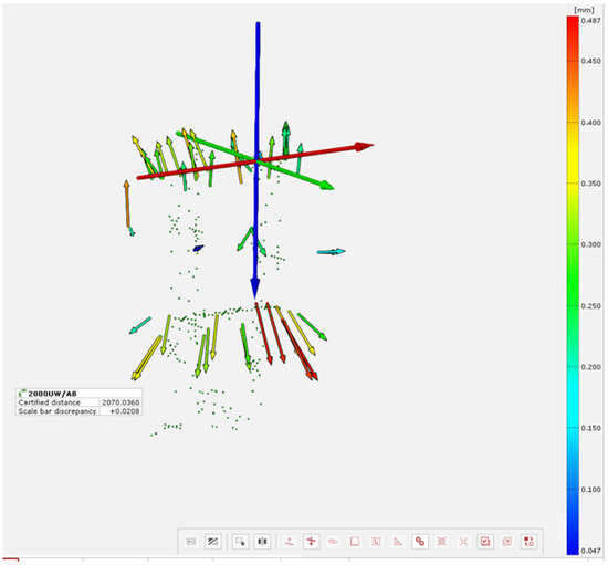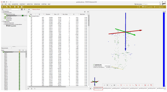 The results were analyzed in the dedicated TRITOP Professional software. Built-in inspection tools were used for this purpose. First, a common coordinate system for all measurements was introduced. Due to the fact that the gondola was able to rotate relative to the vertical axis, compensation for this rotation was introduced in each subsequent measurement. An example screenshot showing a cloud of measurement and reference points is shown in Figure 11. Example displacements of measurement points are shown in Figure 12.
