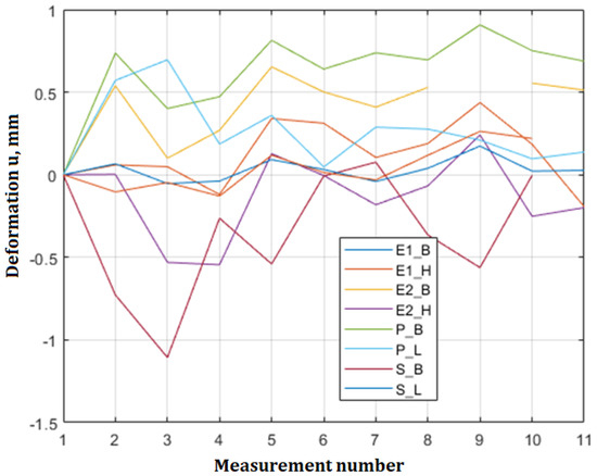 Based on the conducted tests, a set of results was prepared to show the change in the characteristic dimensions of the gondola in the directions mentioned above (deformation of the rings, distances between them, distances between the upper and bottom frames, etc.). The obtained results are summarized in Table 2. For the purposes of a more accurate interpretation of the results, a graph was prepared in Figure 13, showing the change of individual distances (displacements) during subsequent inspections with the DIC system.