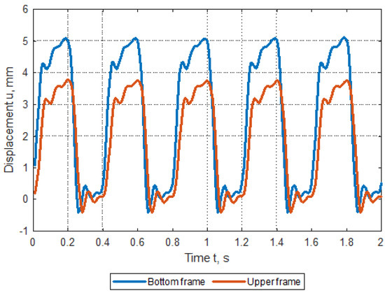 Conducted in parallel to the DIC, research using laser sensors allowed to determine the level of displacement of the bottom and upper frame of the tested gondola. The results are presented in Figure 14. The difference in levels of about mm is the actual spreading of the gondola elements—stretching of the “A” and “B” rings. The slight phase shift shows the delay in the appearance of the displacements between the frames.