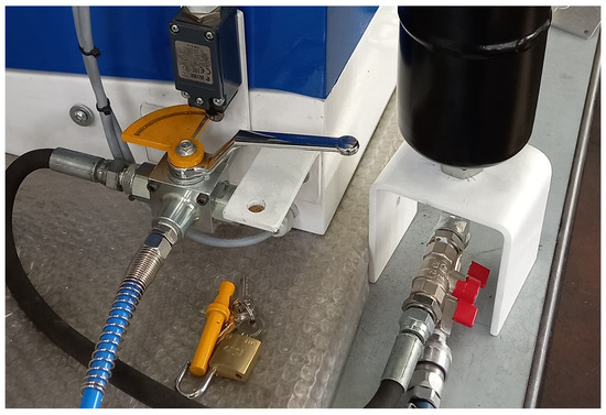 Figure 3 shows a zoom of the mechanical part of the machinery in which it is possible to depict the component dedicated to the insertion of a mechanical lock to lock relevant energy sources (to achieve the usual LoTo procedure). Furthermore, the machinery has been equipped with an innovative “Smart Service Modal Selector” (SS) (as required for any mode by MD, Annex I, par.1.2.5 [