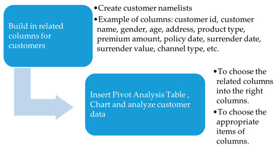 In this step, students need to choose their own company, position their company, and build their customer namelists in the micro-database through Excel software. For example, the fieldname of customer name lists contains customer ID, customer name, gender, customer age, occupation type, customer address area, policy number, premium amount, product type, channel type, policy date, surrender date, surrender value, premium paid method, campaign code, etc. After finishing the database, students need to learn the operation of a pivot analysis table or chart and try to execute comprehensive customer analysis.