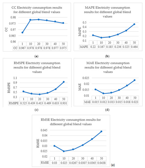 Moreover, Figure 2 illustrates the effects of the global blend of the K* model on the CC, MAPE, RMSE, RMSPE, and MAE for electricity consumption prediction.
