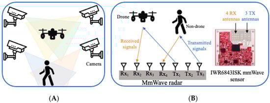 The detection of unwanted drones poses significant challenges to observation systems, especially in urban areas, as drones are tiny and move at different rates and heights compared to other moving targets [2]. For target recognition, optic-based systems that rely on cameras provide more detailed information than radio-frequency (RF)-based systems, but these require a clear frontal view, as well as ideal light and weather conditions [14,15], as shown in Figure 1A. Both residential and business environments are less accepting of the use of cameras for target recognition because of their intrusive nature [16]. Although RF-based systems are less intrusive, the signals received from RF devices are not as expressive or intuitive as those received from images. Humans are often unable to directly interpret RF signals. Thus, preprocessing RF signals is a challenging process that requires the translation of raw data into intuitive information for target recognition. It has been proven that RF-based systems such as WiFi, ultrasound sensors, and millimeter-wave (mmWave) radar can be useful for a variety of observation applications that are not affected by light or weather conditions [17]. WiFi signals require a delicate transmitter and receiver and are limited to situations where targets must move between the transmitter and receiver [18]. Because ultrasound signals are short-range, they are usually used to detect close targets and are affected by blocking or interference from other nearby transmitters [14].