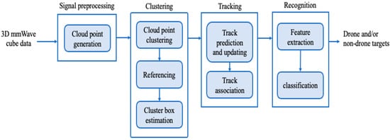 The proposed framework for the simultaneous tracking and recognition of drone targets using mmWave radar is presented in this section. A front-end mmWave radar system with three transmitting antennas (Tx) and four receiving antennas (Rx) is shown in Figure 1. The mmWave radar transmits multiple frequency-modulated continuous waveform (FMCW) chirps. These signals are received by the receiving antennas after being reflected from multiple targets in the FoV. The radar then combines the Tx and Rx signals to demodulate the FMCW signals and generate intermediate-frequency (IF) signals, creating a time-stamped snapshot of the FoV [36]. The collected sequence of IF signals is insufficiently informative and, hence, was applied to preliminary preprocessing to extract some features of the target, such as the range, velocity, and angle [20,36]. Figure 2 shows the proposed framework, which consists of four modules, which operate using a pipelined approach as follows: