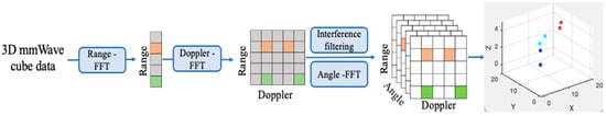 The raw IF signals were collected in the form of a 3D cube data (time, chirp, and antenna). Fast Fourier transformations were performed on the IF signals to estimate the range, velocity, and angle of arrival (AoA) of the moving target [14,37]. A cloud point is a 3D model composed of a set of points used in the literature to describe a list of detected targets provided by radar signal processing [38]. Figure 3 illustrates a four-step signal preprocessing workflow to generate a series of cloud points, each comprising different features, such as the 3D spatial position (x, y, and z), velocity, and AoA [39].