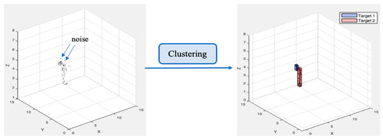 The generated point clouds are sparse and insufficiently informative for recognizing distinct targets in the FoV. Furthermore, while static targets and noisy background reflections were removed through interference filtering, as discussed in Section 4, the remaining points are not always reflected by the targets. As shown in Figure 4, these interference points can be significant and can lead to confusion with points from nearby targets. Therefore, in this module, a clustering algorithm was applied to remove noise points in the point cloud, in addition to grouping sparse point clouds into several clusters, each corresponding to a single target present in the FoV.