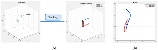 During the tracking phase, the new position of the detected target is estimated sequentially, as shown in Figure 5A, followed by the temporal association of the new estimated track and target cluster to create a continuous target track, as shown in Figure 5B. The workflow of the proposed multiple-target-tracking-algorithm is shown in Figure 6. The components of the proposed target tracker are explored in detail below.