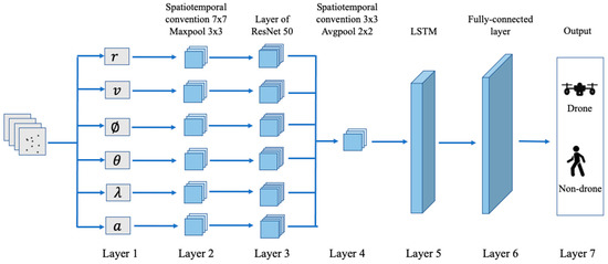 The CNN model consists of seven layers, as shown in Figure 8. Layer 1 is the input layer containing the six attributes: radial distance in meters, velocity in meters/second, azimuth angle in degrees, elevation angle in degrees, height in meters, and area in . Layer 2 is made up of six distinct modules, each of which is made up of a spatiotemporal convolution with kernel size , maximum pooling composition with a sum size , rectified linear unit (ReLU) activation functions, and maximum pooling with pooling area size and a stride of two. Layer 3 is made up of six separated ResNet50. Layer 4 is made up of spatiotemporal convolution with kernel size and average pooling with a pooling area of size to fuse the six features. Layer 5 is made of an LSTM layer with an input size of 256 and a 128-cell hidden layer with a dropout probability of 0.5. Layer 6 is made of two fully connected (FC) layers and a ReLU activation function hidden layer to determine the output of the nodes in the FC. The final output layer would have three nodes, corresponding to the three classes of drone, non-drone, and drone and non-drone targets.