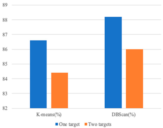 The proposed clustering algorithm based on DBScan was compared to the well-known K-means clustering algorithm, as shown in Figure 9. The clustering accuracy achieved 88.2% for one target and 68.8% for two targets. The proposed clustering algorithm was more accurate than the K-means algorithm. To improve DBScan’s performance, the weighting parameter in Equation (12) must be defined. The large causes the object to split into two clusters, whereas the small causes loose clusters with many noise points. Practically, we discovered that α = 0.25 yielded better clustering performance. Outliers were blended into clusters when . Points related to a certain target were divided into two groups when = 1 (standard Euclidean distance).