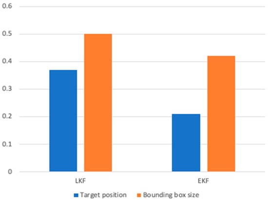 The RMSE for the target position is less than that for the bounding box size. The bounding box size is determined after cloud point clustering, which is used to extract the predicted track. In rare circumstances, the algorithm fails to extract the precise bounding box of the tracked object when noise points are not filtered from the FoV. In addition, EKF has a shorter computational time since transition matrices are not required for the calculation due to the linearization effect.