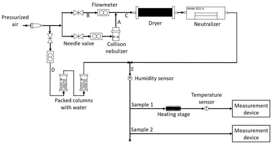 An optional second stream of the pressurized air (D) is passed through two packing columns with water to increase the relative humidity. The mixing ratio between this stream and the preconditioned aerosol determines the humidity and volume flow of the final aerosol (E). The conditioned aerosol is then led into the test section, where two samples can be measured simultaneously. Various measuring devices can be installed to detect the temperature, the particle size distribution and the particle mass concentration. In addition, a self-developed heating stage and humidity monitor can be placed in front of the sensors for further humidity control. To record the operating parameters, flowmeters from TSI (4000 Series) and sensors from Ahlborn (FHA646-E7C) were used for the aerosol temperature and humidity.