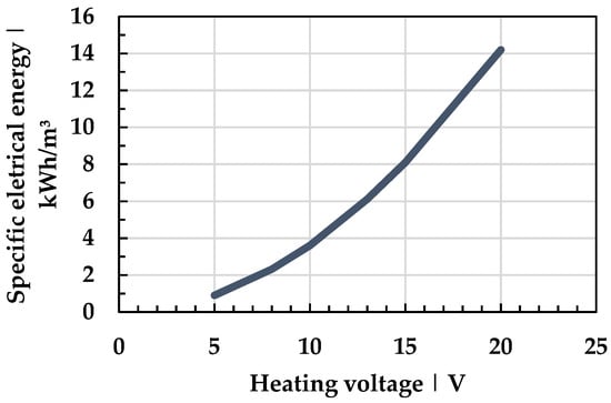 Specific electrical energy depending on the voltage of the heating stage at a volume flow of 0.17 L·min−1.