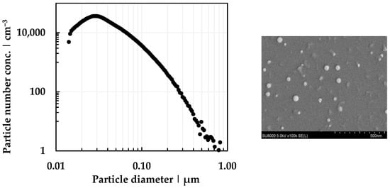 The aerosol mass concentration is regulated by the sodium chloride concentration of the water solution in the Collison nebulizer. The mixing ratio (B:A in Figure 1) is set at a constant of 6:1, resulting in a total volume flow of 30 L·min−1. The particle size distribution (PSD) of the generated aerosol is measured with the SMPS at position Sample 1. For the lowest-used NaCl concentration (0.25 g·L−1), the PSD is shown in Figure 3, with an image from the scanning electron microscope (SEM, Model SU8000, Hitachi High-Tech Corporation, Krefeld, Germany). The sample was taken by the Nanometer Aerosol Sampler (Model 3089, TSI GmbH, Aachen, Germany).